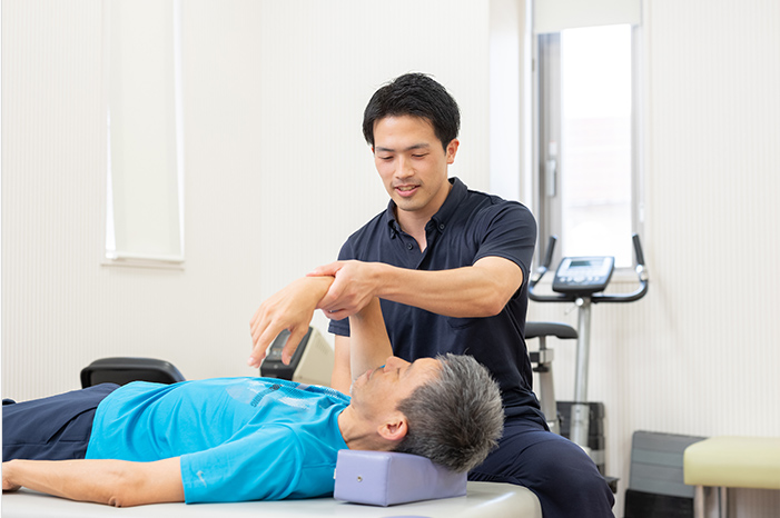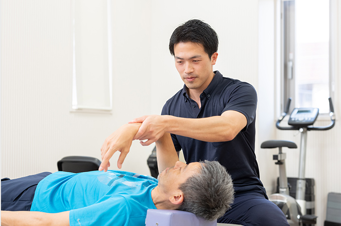 当院では、患者さんの状態や持病、年齢、生活背景などを考慮した個別のリハビリテーションを行っています。内容は人によってさまざまで、理学療法士が身体の状態を評価し、関節可動域の改善や筋力強化、バランス機能向上などを目的とした個別プログラムをご提供いたします。また、スポーツをされているかたには、早期復帰とパフォーマンス向上を目指したスポーツリハビリテーションも行っています。